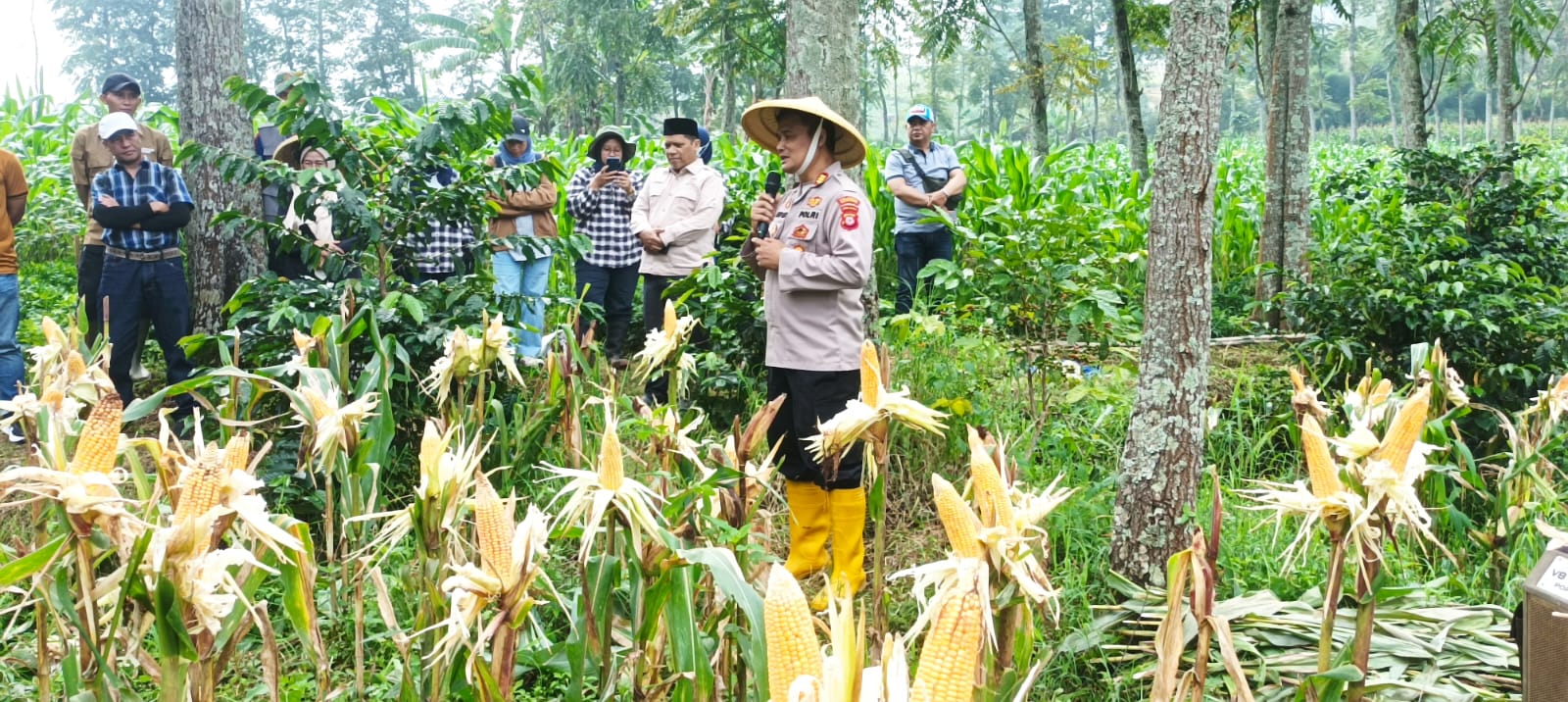 Tampak terlihat Kapolsek Pameungpeuk Polresta Bandung Polda Jabar AKP Asep Dedi, SH., melakukan panen raya jagung bersama masyarakat dan Kelompok Tani Sari Bumi. Tak sendiri, gerakan menjaga Ketahanan Pangan Nasional ini turut dihadiri oleh unsur Muspika Kecamatan Arjasari, seperti Camat Arjasari, Danramil Arjasari hingga Dinas Pertanian Kabupaten Bandung.