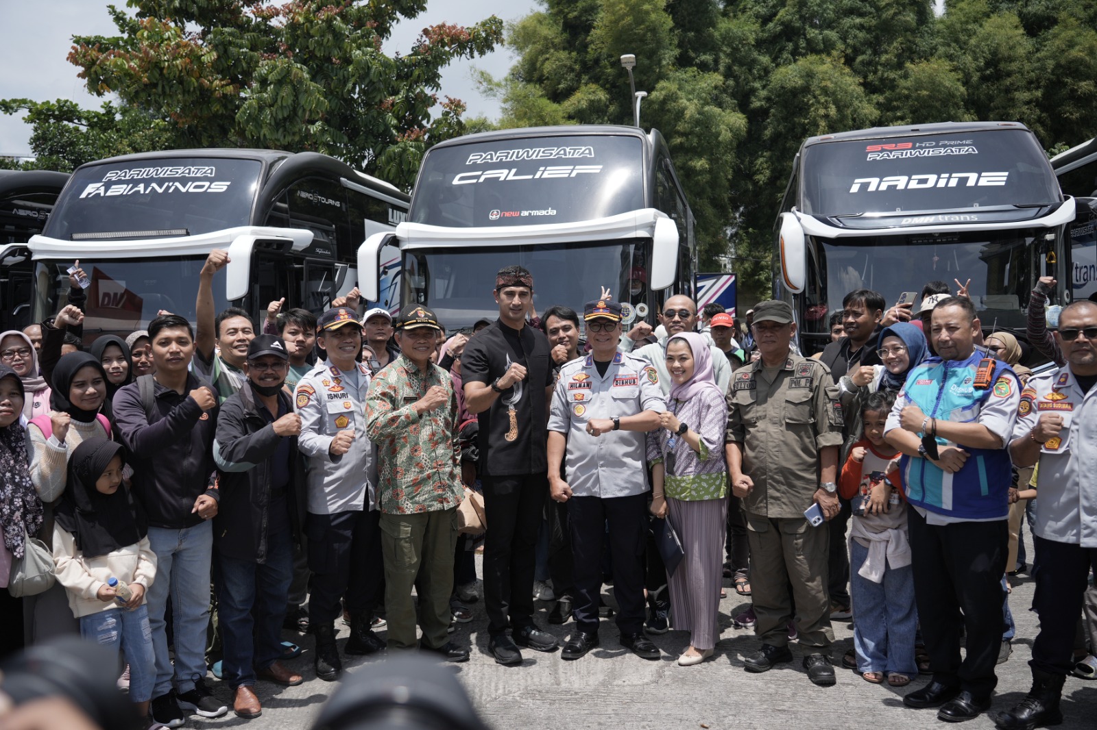 Bupati Bandung Dadang Supriatna diwakili Wakil Bupati Bandung Ali Syakieb didampingi Asisten Perekonomian dan Pembangunan Kabupaten Bandung Kawaludin dan Kepala Dinas Perhubungan Kabupaten Bandung Hilman Kadar serta jajaran personel Dinas Perhubungan lainnya turut melepas 700 peserta mudik gratis bagi masyarakat di lapangan parkir Gedong Budaya Soreang, Kamis (27/3/2025).