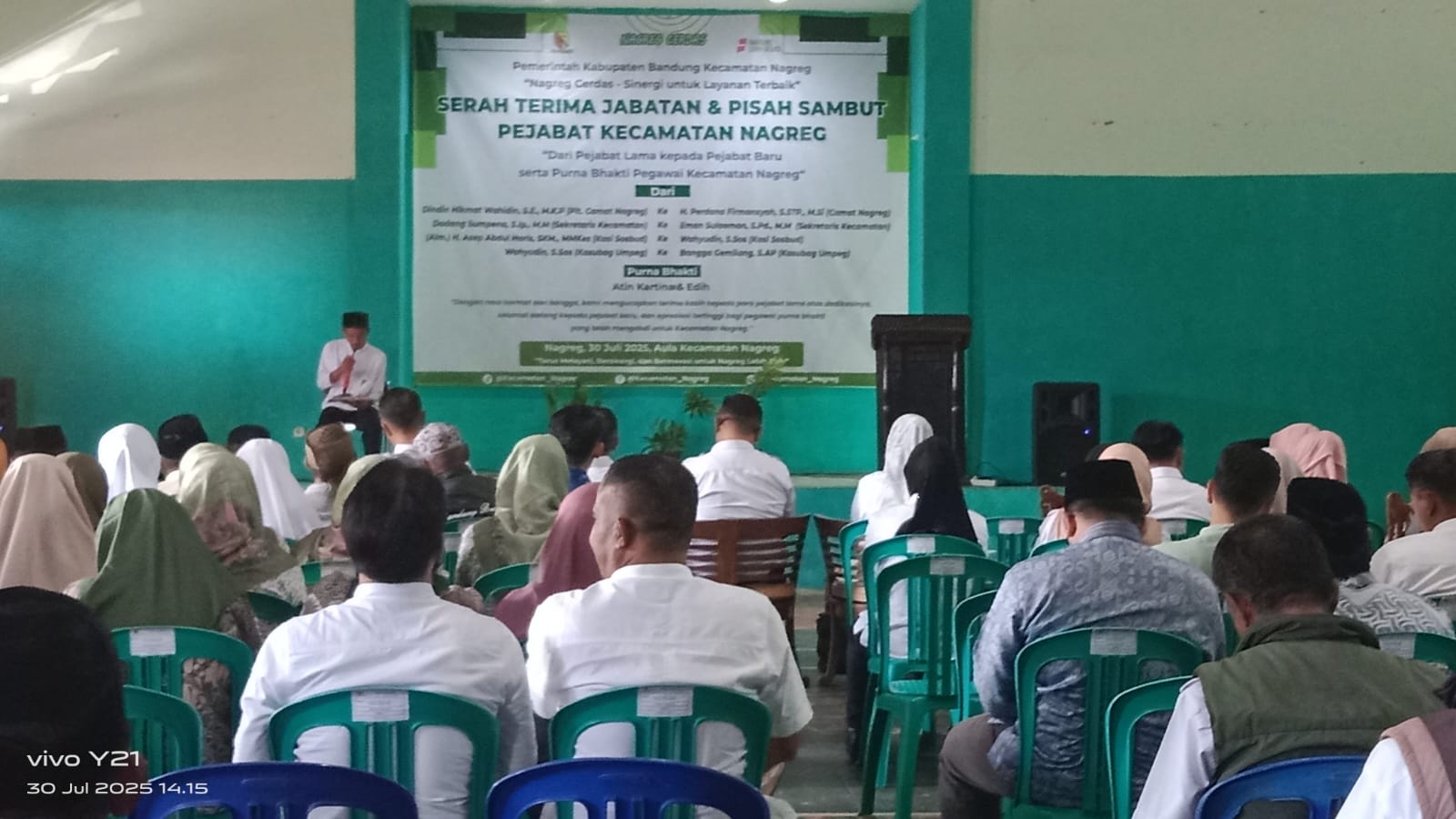 Dalam momen tersebut, dilakukan serah terima jabatan Camat Nagreg dari dilakukan serah terima jabatan dari Plt Camat Bapak Dindin Hikmat Wahidin, S.E,M.K.P, kepada Camat baru, Bpk H Perdana Firmansyah, S.Stp,M,Si ,Serah terima ini ditandai dengan penandatanganan berita acara serta penyerahan simbolis buku memori jabatan Camat Dindin Hikmat Wahidin, kepada pejabat baru, Selain itu, acara juga dirangkaikan dengan pelepasan purna tugas sejumlah pegawai yang telah mengabdikan diri puluhan tahun bagi pelayanan masyarakat di wilayah Nagreg.