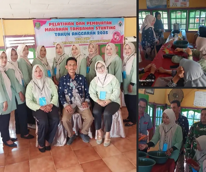 Kab Bengkulu Tengah, KilasNusantara.id — Puskesmas Taba Lagan bekerja sama dengan Pemerintah Desa Bukit,Kecamatan Semidang Lagan,Kabupaten Bengkulu Tengah,Provinsi Bengkulu,menggelar Pelatihan Pembuatan Makanan Tambahan (PMT) berbahan pangan lokal dalam upaya menekan angka stunting dan meningkatkan status gizi balita serta ibu hamil dengan Kekurangan Energi.Kegiatan ini dilaksanakan di kantor Desa Bukit pada hari Kamis tanggal 3/7/2025.yang lalu,