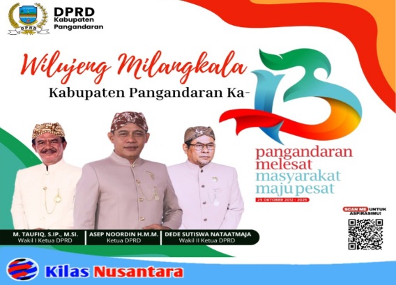 PANGANDARAN, KilasNusantara.id — 23 Oktober 2025, Dalam rangka memperingati Hari Jadi ke-13 Kabupaten Pangandaran, Dewan Perwakilan Rakyat Daerah (DPRD) Kabupaten Pangandaran menyampaikan ucapan selamat sekaligus harapan untuk kemajuan daerah melalui pesan resmi bertajuk “Wilujeng Milangkala Kabupaten Pangandaran Ka-13”.